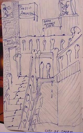 "The Casbahs of Morocco are not dead cities but rather the remains of ancient sperm volcanos where human bioplasm still dwells, has sex, reproduces, process food etc. Sperm, crawling by candle light, the charcoal brasiers cool, the sperm goes waits. There has been so much fucking going on it does not make any difference any more. Here and now go fuck until there is no difference between cum now and cum/three thousand years ago. These ancient sperm stained dwelling places have no beginning and no end. They are like great mounds of dried sperm cake, the bacon that everything in made from.- you and I to, just another kinds of bacon.